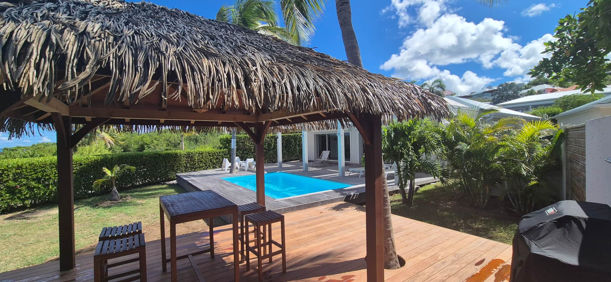 Villa Marine is an entirely new and contemporary "Caribbean" villa with direct access to the Cul de sacBay... with your feet in the water! 2 large bedrooms with complete bathrooms, fully equipped trendy kitchen with a central island for your aperitifs, a large living room with table and chairs for your meals inside opening onto a terrace which also offers a table and chairs for 4 people, the swimming pool and the garden in front of you.... a private parking spot is at your disposal